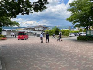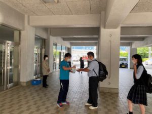 今日は6月8日の授業再開に向けての登校日でした。午前と午後の2グループに分けての分散登校で、校舎の入り口では検温の確認、手指消毒、マスクの着用の指導も行われました。前日には教員による校舎内外の清掃が行われ、生徒が下校した後のアルコール消毒を行うなど感染対策にも十分配慮して実施しました。