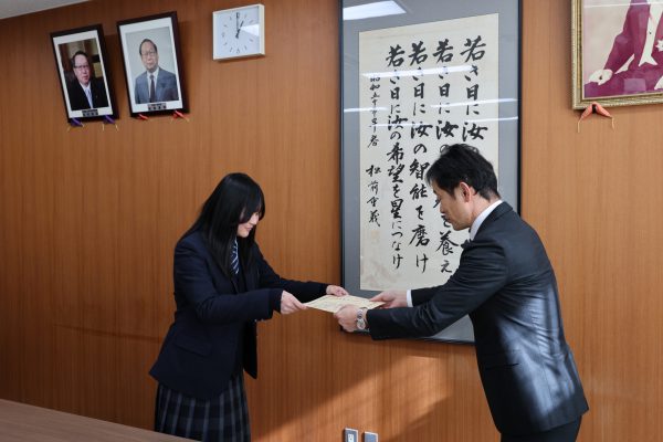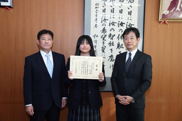 国税庁主催の「税に関する高校生の作文」で、本校1年生の関優美さんが、税務署長賞を受賞しました。本日、甲府税務署長の小林様にご来校いただき、校長室で賞状授与と記念品贈呈式を行いました。山梨県内でも数名の受賞となりました。関さん、おめでとうございます。